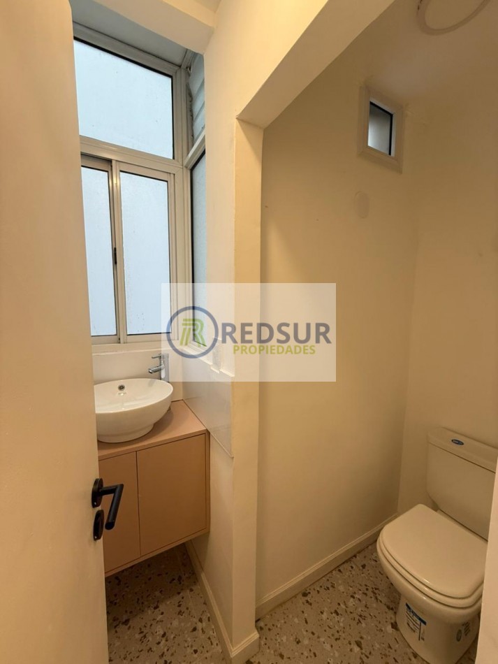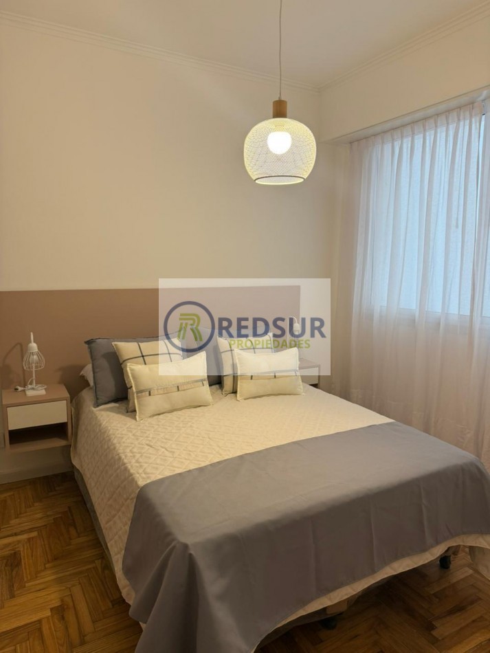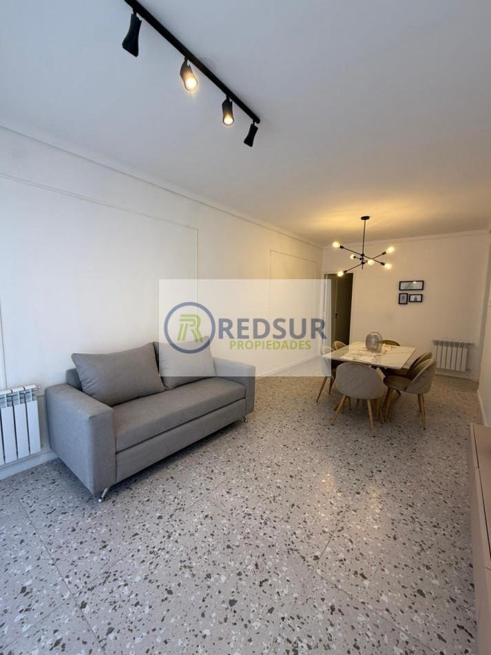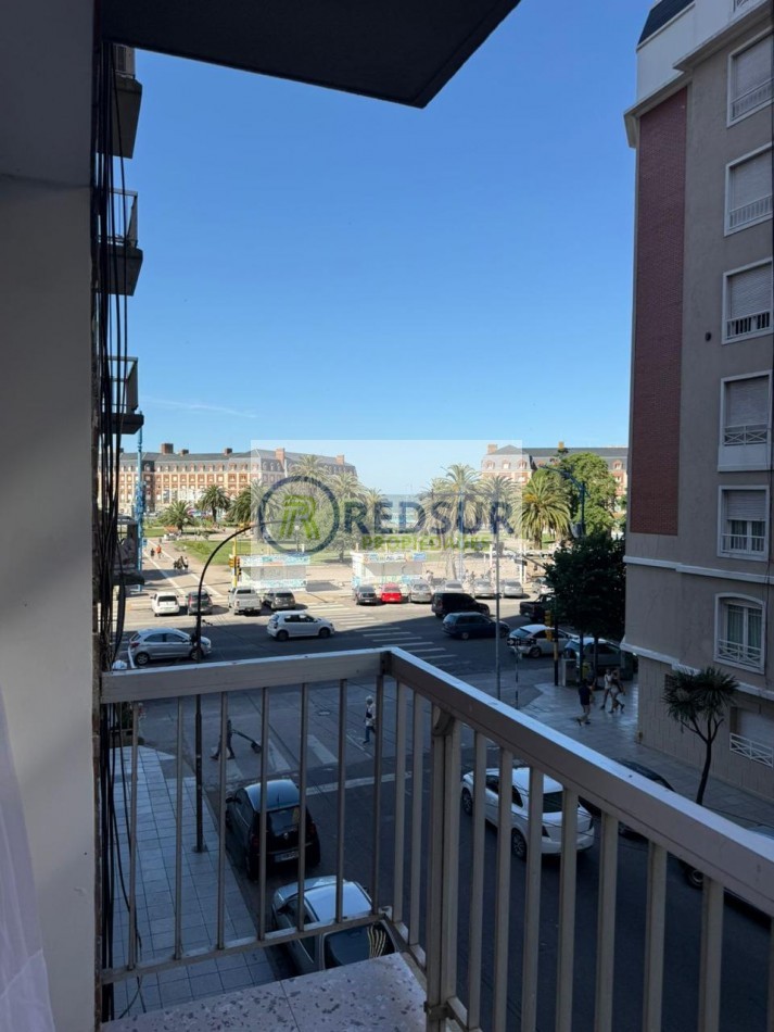 Amplio living comedor con balcón saliente a la calle y vista lateral a la plaza y al mar